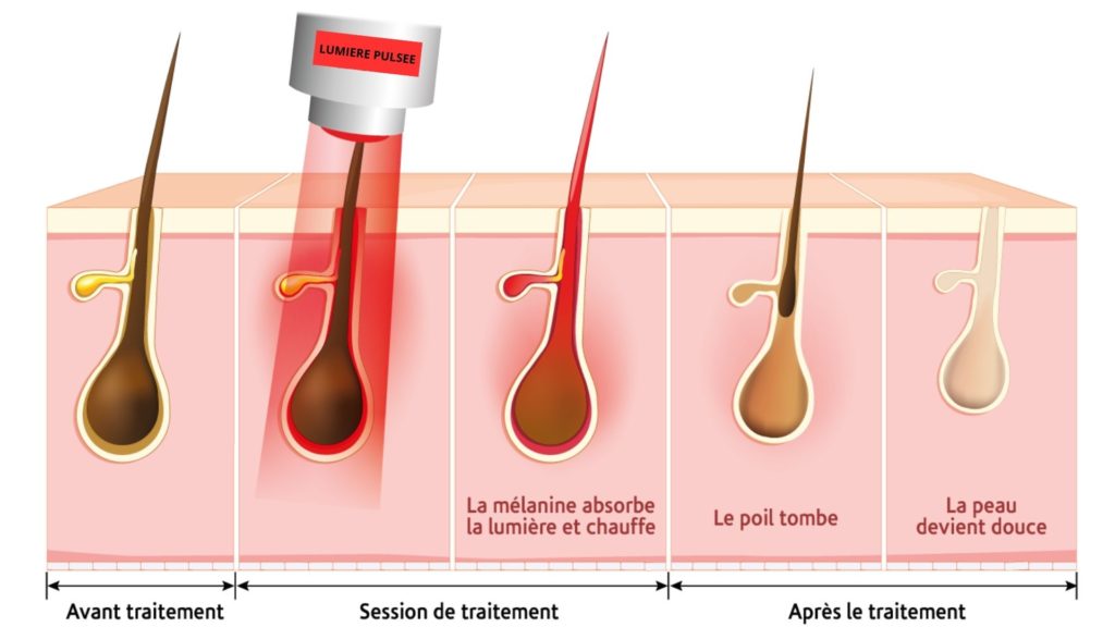 Le principe repose sur la photothermolyse: la lumière pulsée est transformée en chaleur par le poil, conduite le long de la tige pilaire, pour arriver jusqu’ à la racine des poils en phase de croissance afin d’en assurer sa destruction.